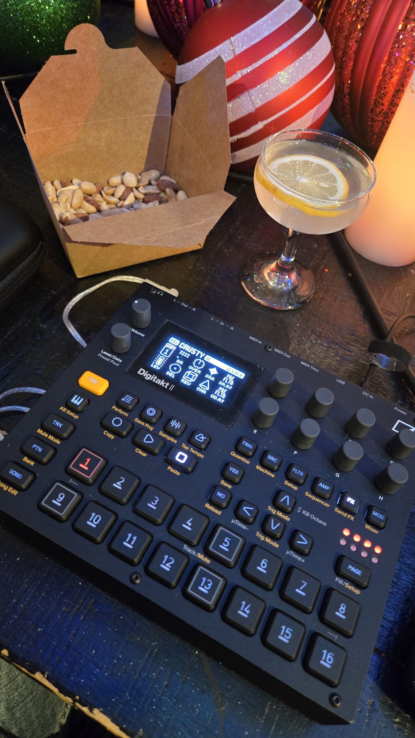 For the first time ever, I performed electronic music solo. I recently found and joined the Richmond Synth Collective. At the monthly meeting I joined the open mic, and played a jam on my Digitakt II called “Crusty.” Here’s a video of the performance — WARNING: the video is missing for the first couple of minutes since my wife recorded but, well, put her phone on the table. The picture to the left is where I was prepping for the performance. Note especially the French 75, a cocktail I’d first tried in NOLA and fell in love with, to steady my nerves!